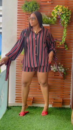 Women Turndown Collar Button Stripe Sweater + Shorts Two-Piece Set