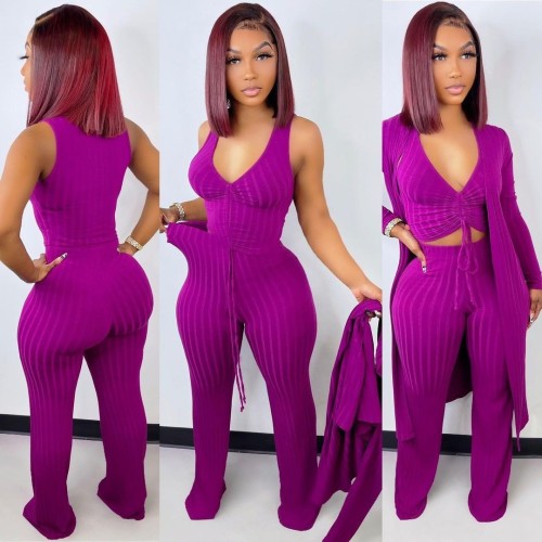 Women's Solid Color Cape Jacket Sleeveless Ruched Top Wide Leg Pants Three-Piece