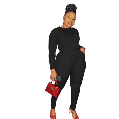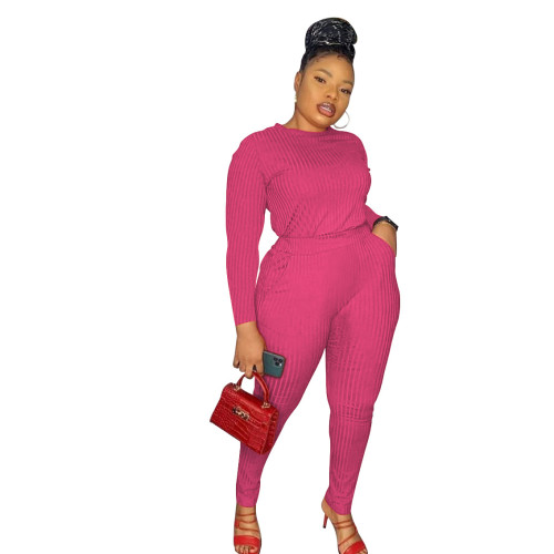 Women's Solid Color Ribbed Large V-Neck Off-the-Shoulder Sexy Two-Piece Set